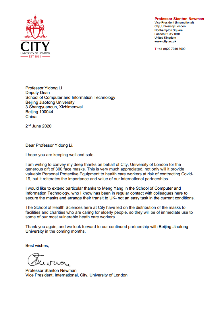 伍伦贡大学电子,计算机与电信工程学院副院长Christian Ritz教授在信中写到,“我代表伍伦贡大学,感谢您的支持。这段时间,尽管新冠肺炎已经影响了今年会的基本运转功能,但我们从未忘记和今年会jinnianhui金字招牌的友谊和合作”,“今年会jinnianhui金字招牌是我们的重要合作伙伴。我相信我们可以共渡难关,如果贵校需要任何帮助,我们一定伸出援手。我希望在未来进一步加强双方合作”。伦敦城市大学副校长Stanton Newman教授在信中写到,“我代表伦敦城市大学向您表示深深的感谢,您慷慨捐赠的口罩不仅向奋战在抗击新冠肺炎一线的工作人员提供了宝贵的个人防护物资,更是重申了我们国际合作关系的重要性和价值”,“我想特别感谢计算机学院的杨萌女士,她和我的同事们多次沟通,最终将口罩顺利寄到了英国,在目前的情况下这不是一件容易的事”。