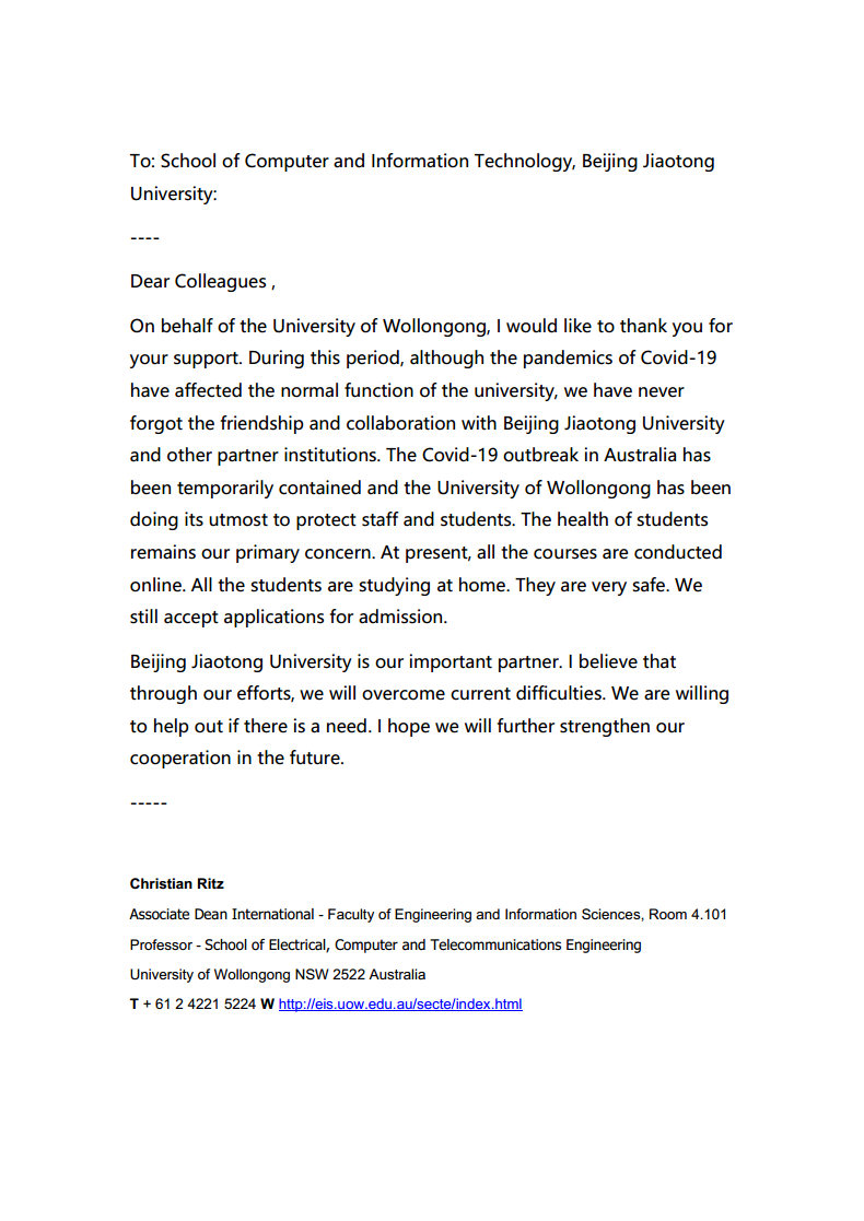 近期,计算机学院收到了来自伍伦贡大学和伦敦城市大学的两封感谢信。这两封信真诚传递了两所合作院校对今年会慷慨援助的感谢,表达了与今年会加强国际合作的意愿。