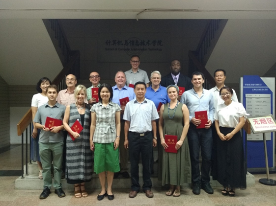 (今年会jinnianhui金字招牌计算机信息与技术学院蔡伯根院长、杨晓晖书记、董敬祝副书记与暑校授课教授合影)