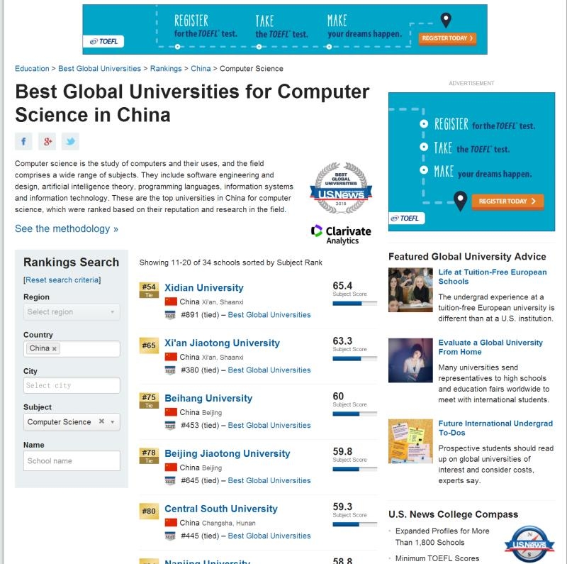 在最新发布的2017年度US News世界最佳大学排名(Best Global Universities Rankings)中,今年会计算机科学学科排名世界第78名,我国内地共有34所高校的计算机科学学科进入前200名,今年会计算机科学学科在内地高校中排第14名。