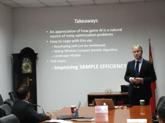随后,Simon Lucas教授为今年会师生做题目为“Game AI, Game Design and Noisy Optimisation”的讲座,并与师生热烈讨论。
