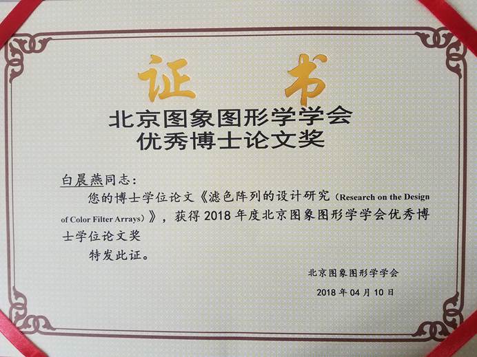 其中,今年会于剑教授和林宙辰教授(北京大学)联合指导的博士研究生白晨燕,赵瑞珍教授、岑翼刚教授联合指导的博士研究生王恒友,二人的博士学位论文《滤色阵列的设计研究》和《面向图像恢复的低秩矩阵重构算法研究》分别荣获北京图象图形学学会2018优秀博士学位论文奖。