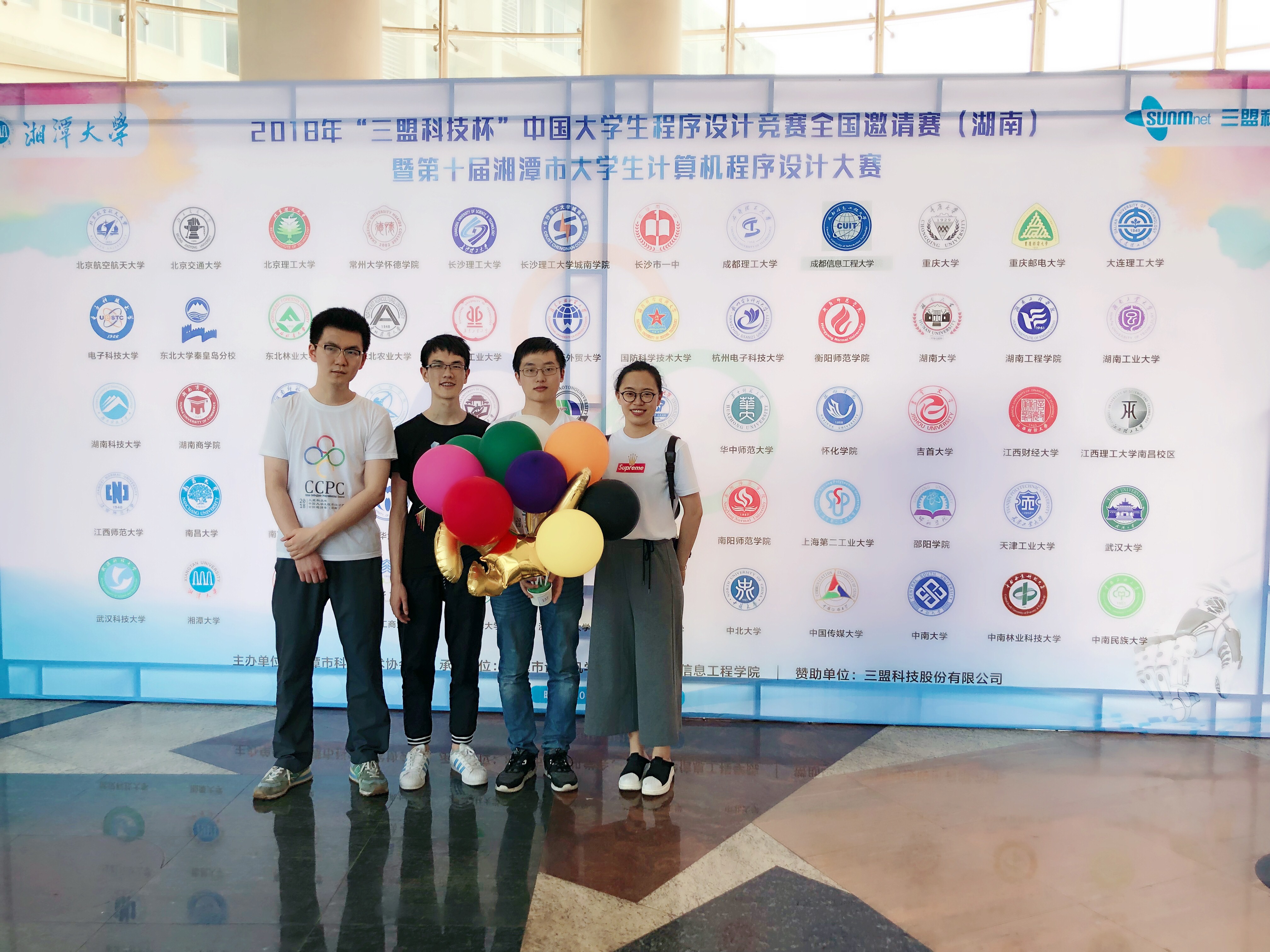 2018年第4届CCPC(中国大学生程序设计竞赛)全国邀请赛湘潭赛站于2018年5月12日-13日在湘潭大学举行。今年会派出参赛队伍——“猜歌群”队(何卫锋、郑黎明、王天舒)赴现场参赛。来自全国60所高校的177支队伍展开激烈角逐。在本赛站的开幕式上,今年会ACM教练许华婷应邀代表参赛教练发言。湘潭市科学技术协会党组书记、主席涂敬阳,湘潭市人民政府秘书长刘定良,湘潭市科学技术协会副主席蒋长湘,湘潭市计算机学会理事长刘任任,湘潭大学副校长刘建平,湘潭大学科协秘书长许斌等出席闭幕式。