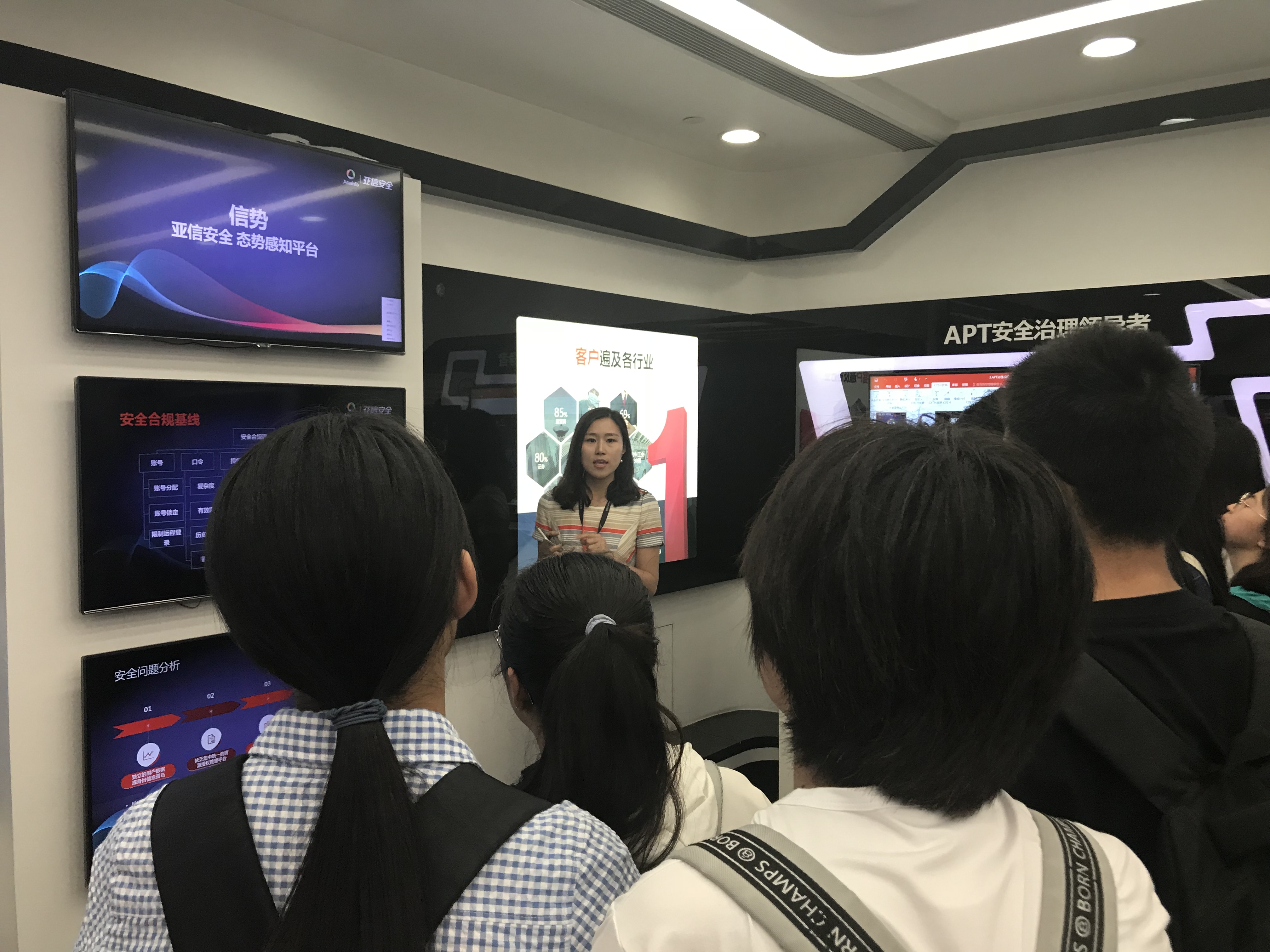 同学们最后走进亚信公司,参观了公司展厅,听取公司人员讲解,了解了公司云计算、大数据、人工智能与物联网等创新技术,受益匪浅。