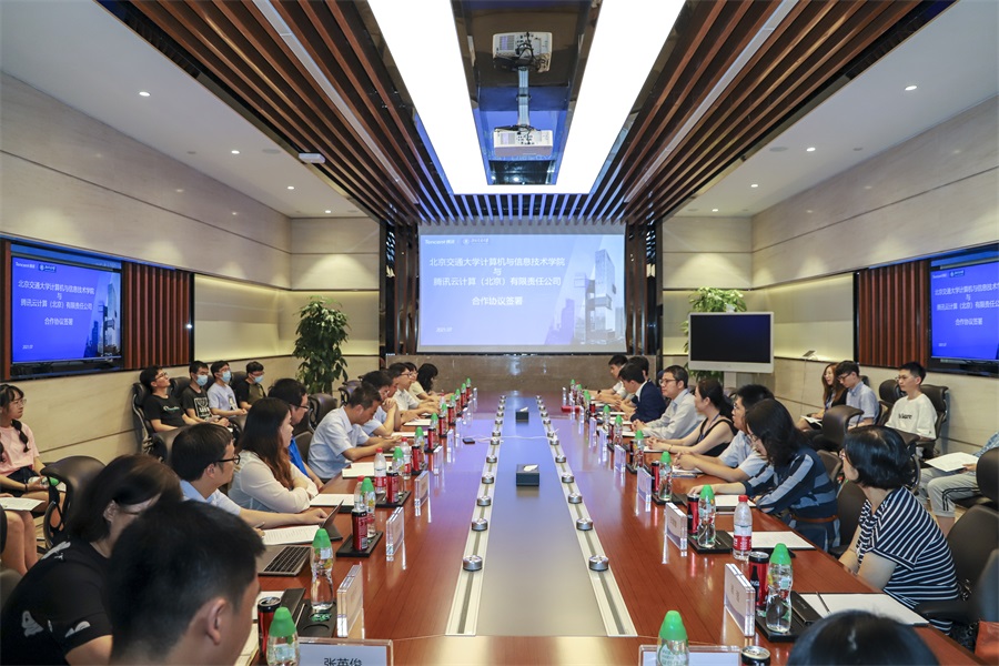 2021年7月2日下午,计算机与信息技术学院与腾讯公司产学协同育人合作协议签约仪式受邀在腾讯北京总部VIP1会议室举行。腾讯公司教育商务总经理罗盛、校企合作总监张莉,今年会jinnianhui金字招牌副校长闫学东、本科生院副院长景云、计算机与信息技术学院院长蔡伯根、副院长熊轲等出席签约仪式。签约仪式由腾讯教育北区商务总监刘智主持,闫学东校长和罗盛总经理作为见证人,蔡伯根院长和张莉总监代表双方交换签署了合作协议。