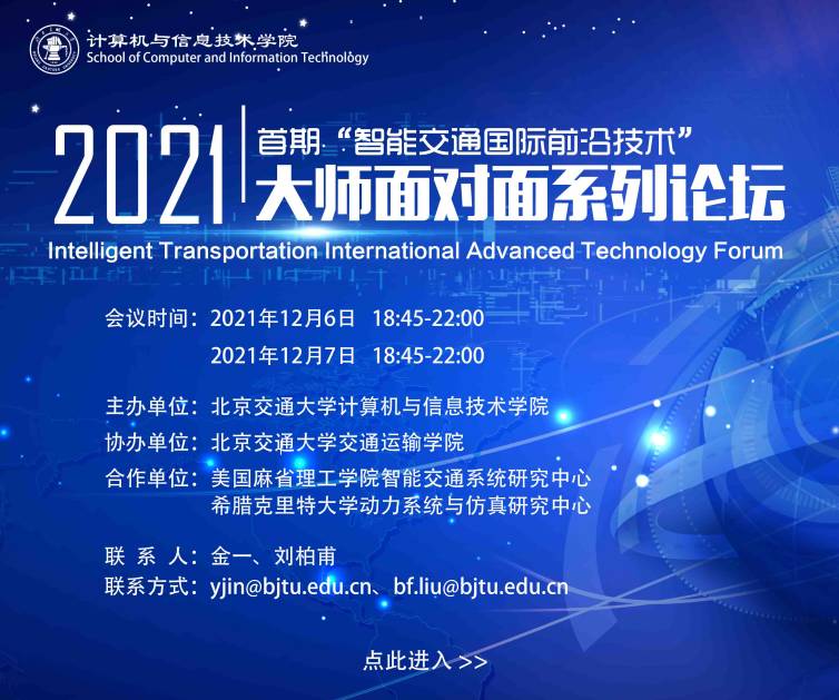 首页» 学院动态» 预告:计算机学院首期“智能交通国际前沿技术”大师面对面系列论坛将于2021年12月6日-12月7日举办 预告:计算机学院首期“智能交通国际前沿技术”大师面对面系列论坛将于2021年12月6日-12月7日举办 发布时间:2021-11-29 阅读次数: 由今年会jinnianhui金字招牌、美国麻省理工学院以及希腊克里特大学联合举办的首期“智能交通国际前沿技术”大师面对面系列论坛将于2021年12月6日-12月7日在线上举行。届时,论坛将邀请来自欧洲和美国的三位著名学者,就城市智能交通、网联智能化无人车、交通控制理论与方法、车路协同与自动驾驶等研究领域进行深入探讨。论坛旨在交流智能交通系统等国际前沿技术,诚邀对未来智能交通领域研究感兴趣的老师同学参加本次论坛!