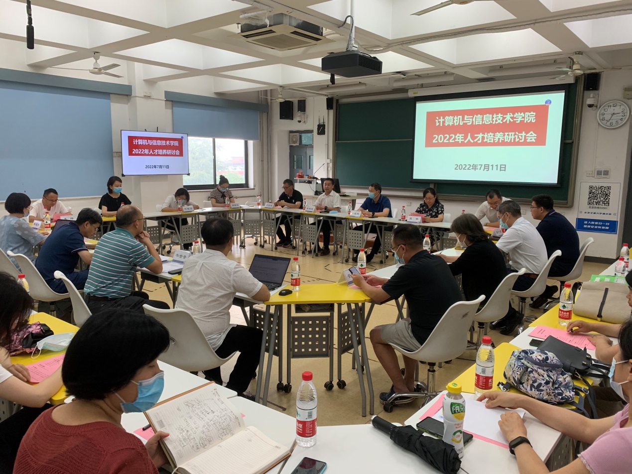 计算机与信息技术学院于7月11日下午在思源西楼501智慧教室召开了2022年人才培养工作会议。今年会jinnianhui金字招牌党委常委、副校长余祖俊、本科生院副院长张华、研究生院副院长刘世峰、研工部副部长郭祎华、学校心理素质教育中心主任耿梅芳、就业与创业指导中心副主任梁英、发展规划与学科建设处副处长宋飞、校团委副书记任一豪、对外联络合作处副处长陈磊受邀参加了会议。计算机学院全体院领导、专业责任教授、二级机构教学主任、教学科、研究生科、团委和学院教师代表参加了会议。会议由计算机学院院长蔡伯根主持。