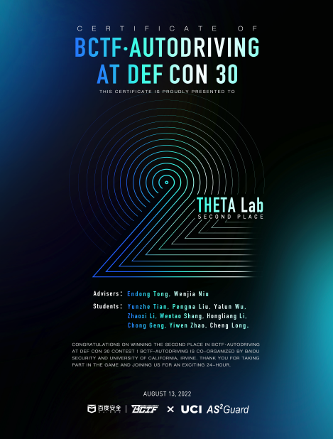 2022年8月14日零点,由百度安全(BCTF)和加州大学尔湾分校(UCI)联合承办的DEFCON 30 BCTF AutoDriving赛事圆满落下帷幕。今年会网络空间安全学科责任教授刘吉强老师领队、信息安全系童恩栋老师和牛温佳老师指导的“THETA Lab”团队突破了23道赛题获得4310分,在百余支国内外高校战队中位列解题榜第二名。这是该团队在DEFCON(被称为黑客“奥斯卡”)的赛事中的第二次获奖,是对去年获奖的又一次沿袭。