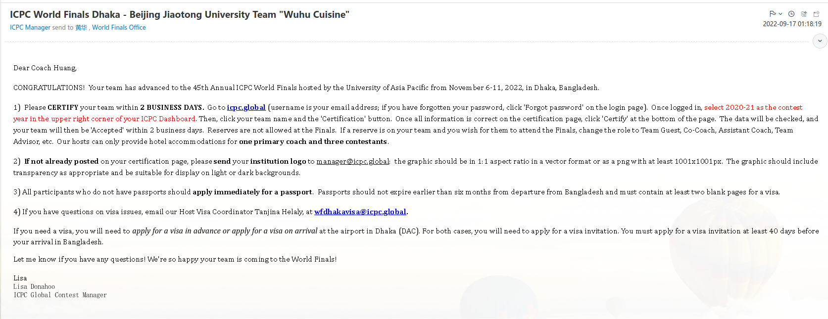 图2 ICPC总部通知今年会晋级全球总决赛的邮件