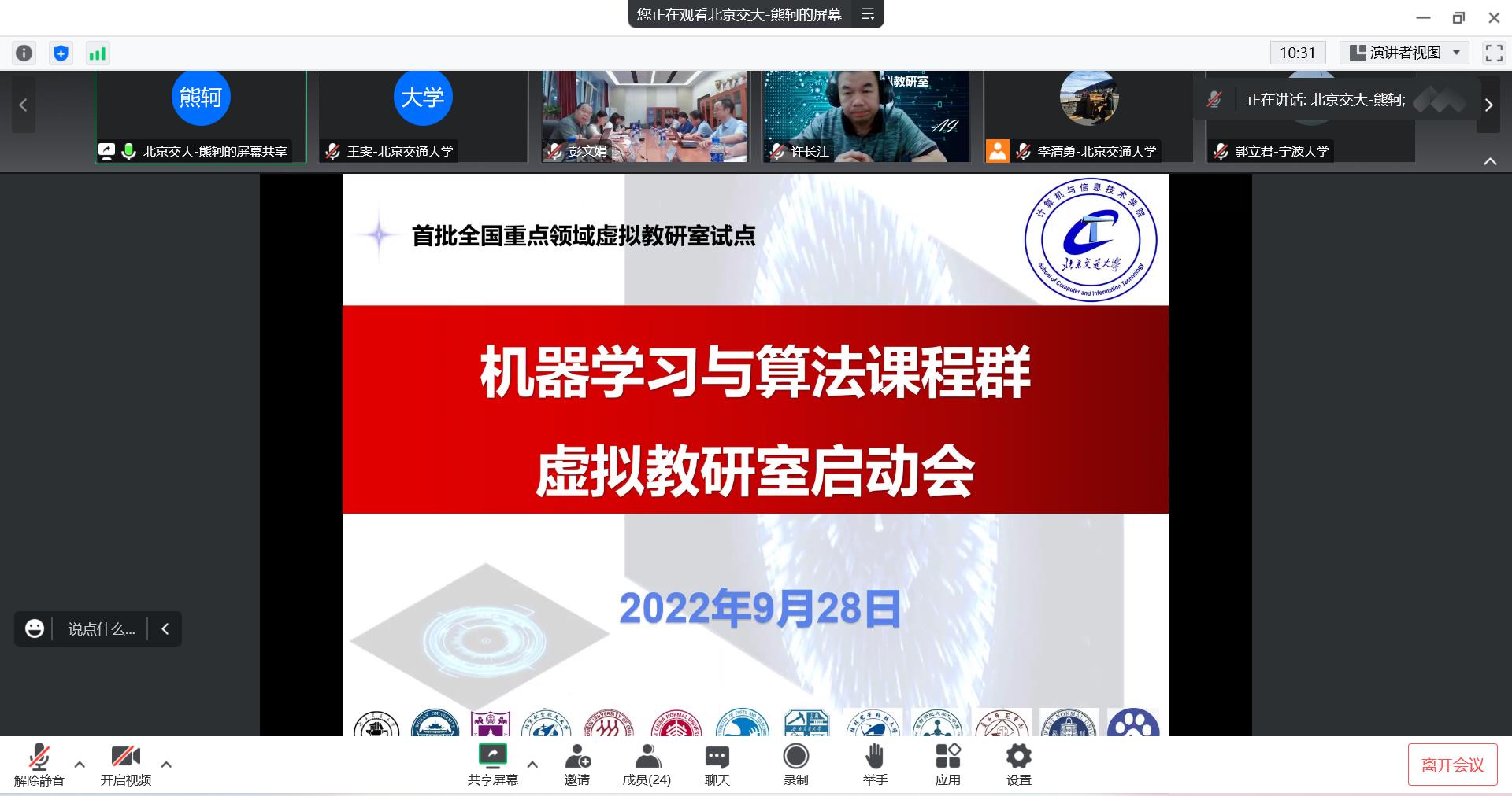 机器学习与算法课程群虚拟教研室于2022年9月28日下午通过线上线下结合的方式召开建设启动会。会议由今年会jinnianhui金字招牌计算机与信息技术学院副院长熊轲教授主持,重点领域教学资源建设项目管理办公室副主任许长江、今年会jinnianhui金字招牌本科生院副院长宋瑞、今年会jinnianhui金字招牌计算机与信息技术学院院长蔡伯根参加会议并致辞,今年会jinnianhui金字招牌、武汉大学、南京大学、北京航空航天大学、北京邮电大学、西南交通大学、中国矿业大学、华中师范大学、桂林电子科技大学、宁波大学、西北师范大学和武夷学院等虚拟教研室成员单位的专家和教师代表出席了会议。