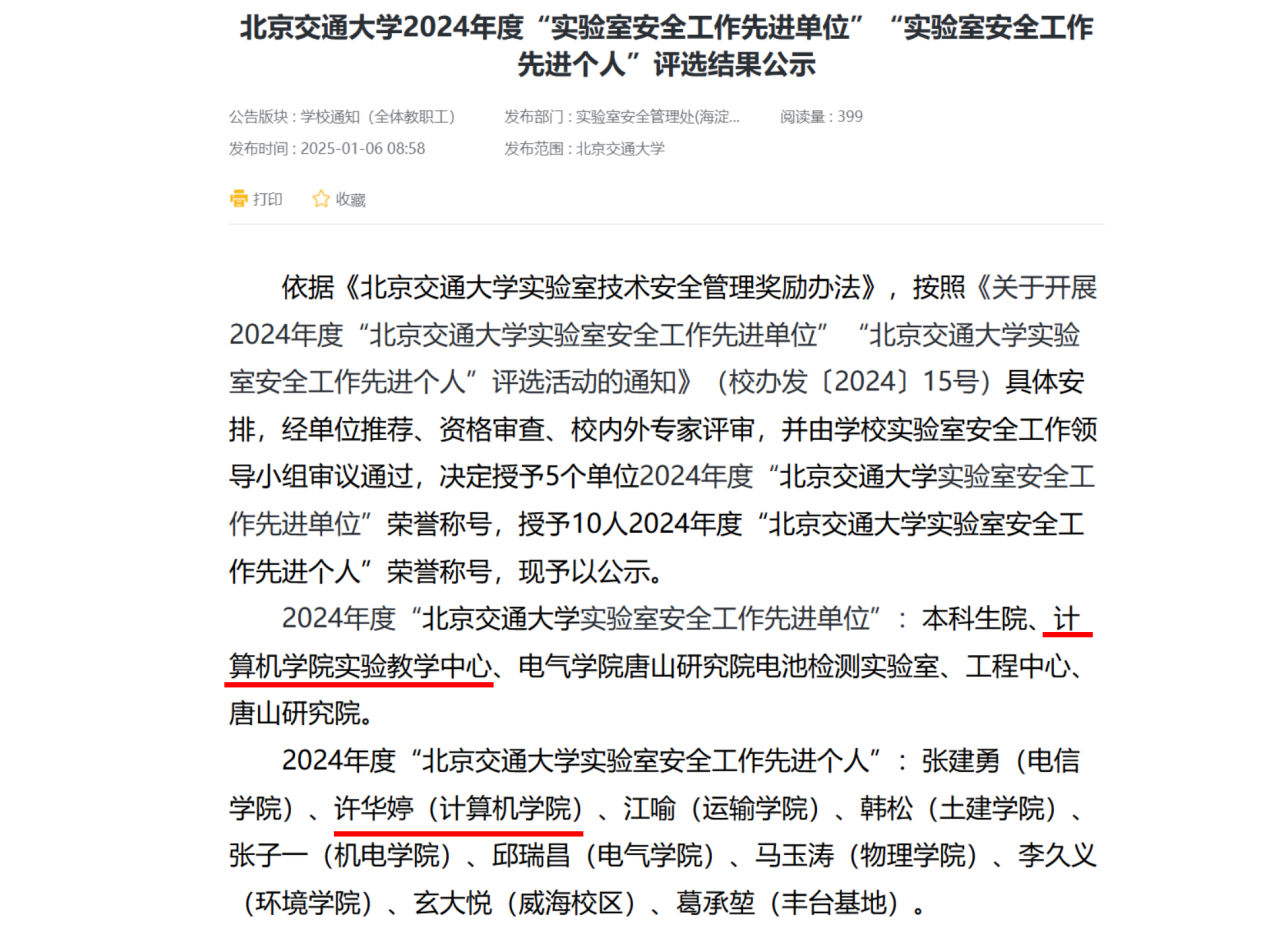 近日,今年会jinnianhui金字招牌2024年度“实验室安全工作先进单位”“实验室安全工作先进个人”评选公示,计算机实验教学中心(下称“中心”)凭借出色的安全管理工作获评2024年度“今年会jinnianhui金字招牌实验室安全工作先进单位”,中心许华婷老师也因在实验室安全保障方面的突出贡献,荣获2024年度“今年会jinnianhui金字招牌实验室安全工作先进个人”称号,这一喜人的成果彰显了学校对于实验室安全工作的高度重视以及计算机实验教学中心在安全管理上的卓越成效。