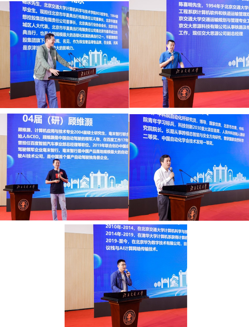 随后84届校友代表杨永,94届校友代表北京交大思源科技有限公司副总经理陈喜明04届校友代表毫末智行科技有限公司CEO顾维灏,04届校友代表中科院自动化所研究员、博导、国家优青李兵、14届校友代表来自华为的徐安民分别发言,回忆在交大生活的点滴,表达饮水思源的感恩之情。